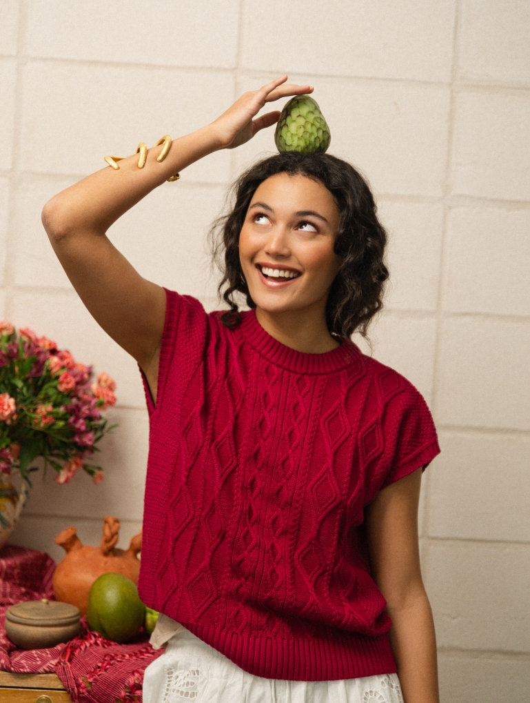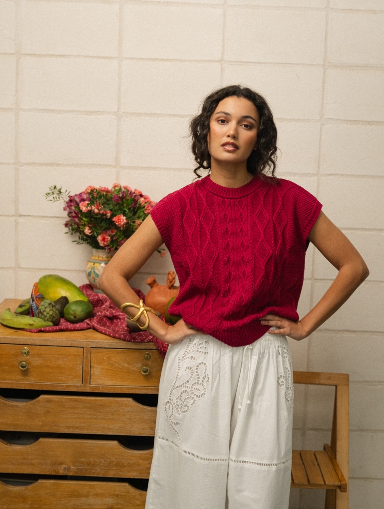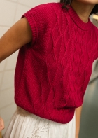 Un chaleco tejido en un algodón muy suave con una textura de trenzas y punto de arroz. Una prenda muy especial en unos colores ideales. Perfecta todo el año, sobre una camisa o camiseta, o sin nada debajo.