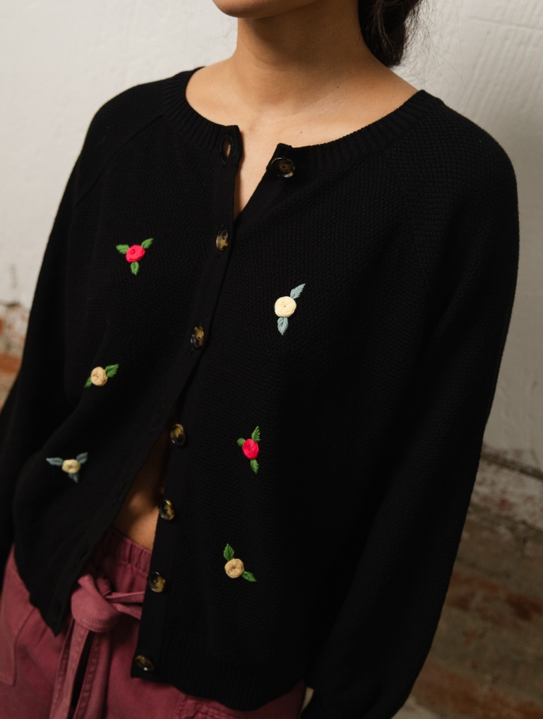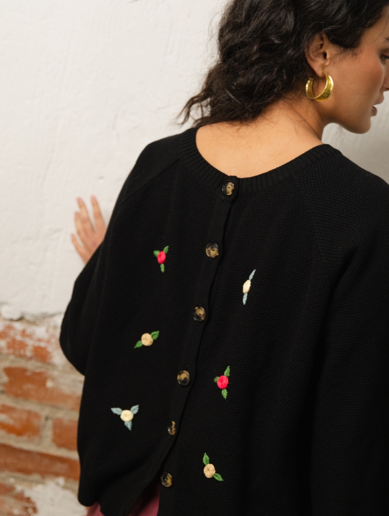 Oaxaca es delicadeza. Un cardigan reversible con unas mangas globo amplias que sientan de infarto. Puedes llevarlo como chaqueta o como jersey con los botones hacia atrás. Con rosas bordadas a mano con hilo grueso de algodón, inspiradas por el colorido de la artesanía mejicana. Uno de vuestros patrones favoritos de Counting Clouds en esta prenda súper especial.