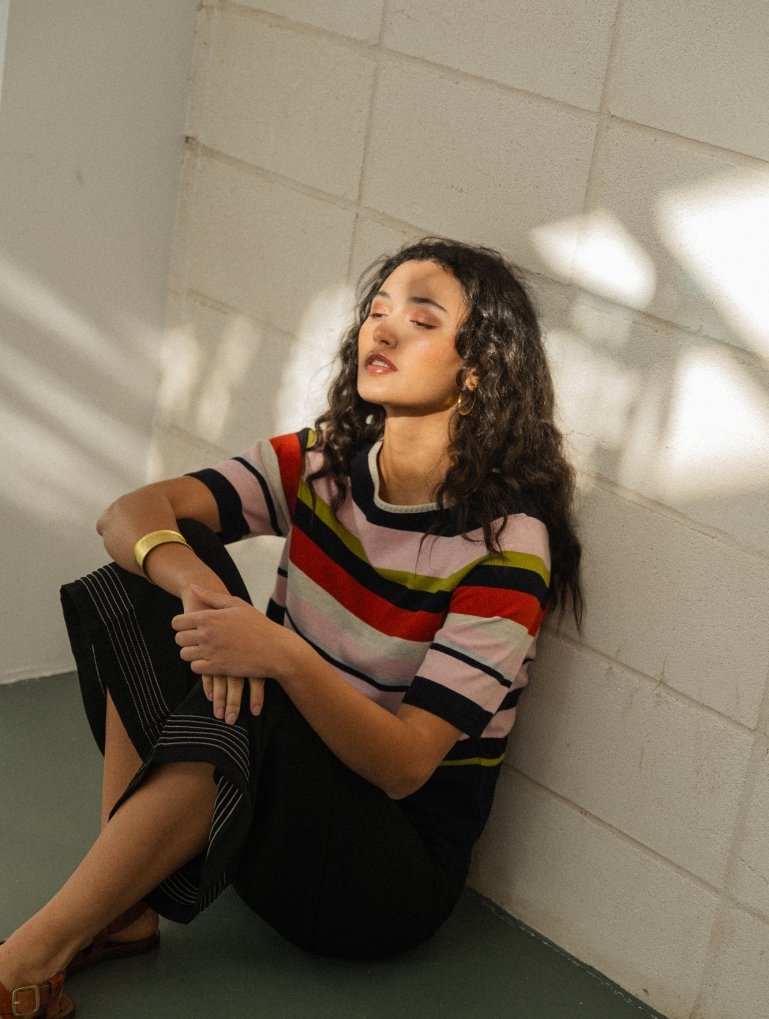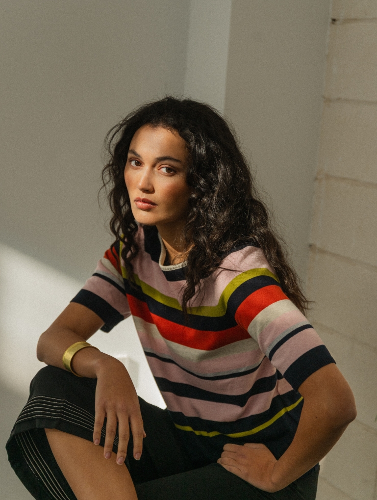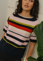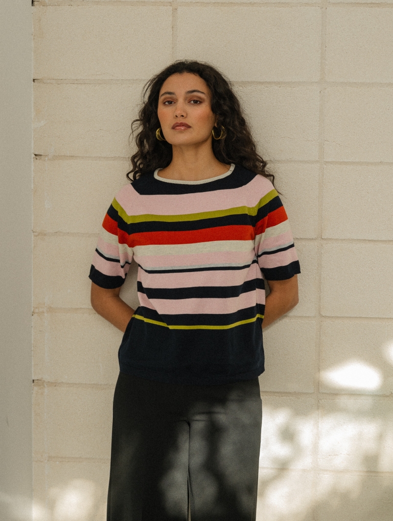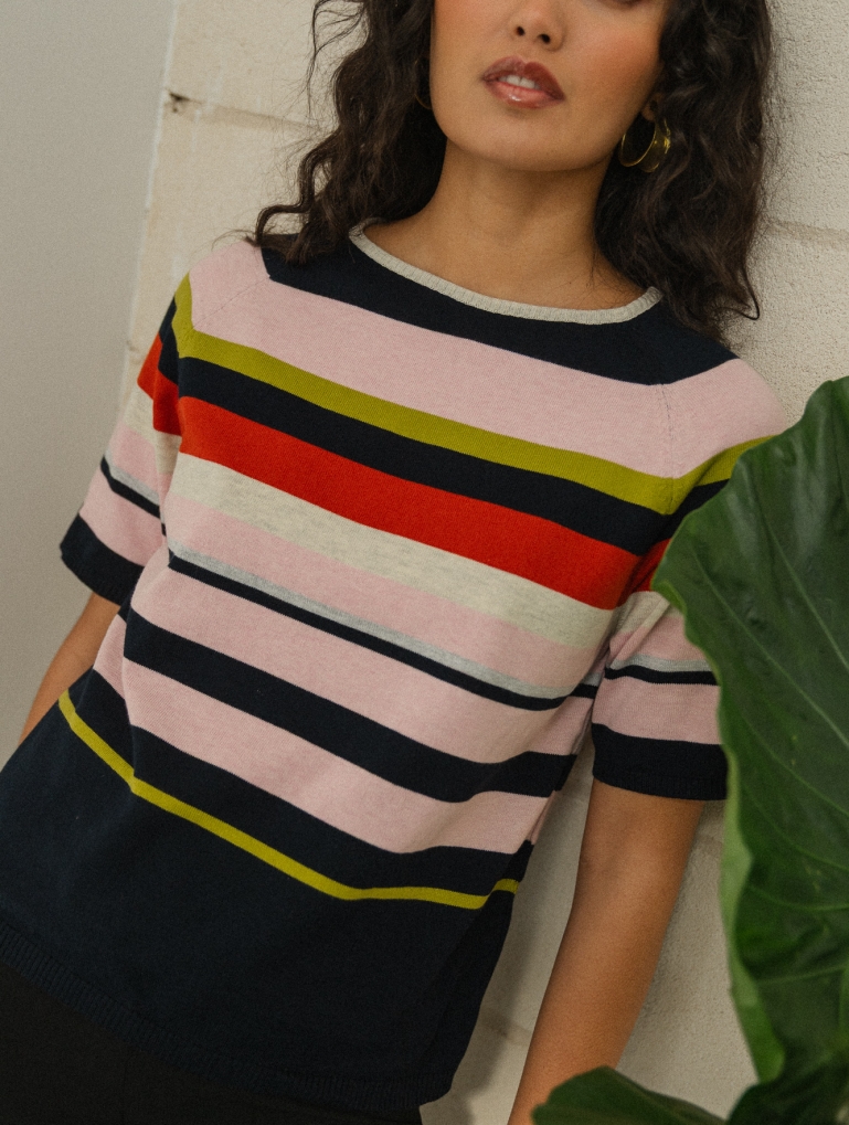 Puebla es un jumper de rayas diferente. Una combinación multicolor alegre y chic. Manga ranglan y cuello barco, que se adapta súper bien y es muy favorecedor. Para redondear cualquier look básico.