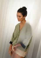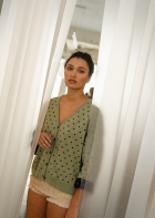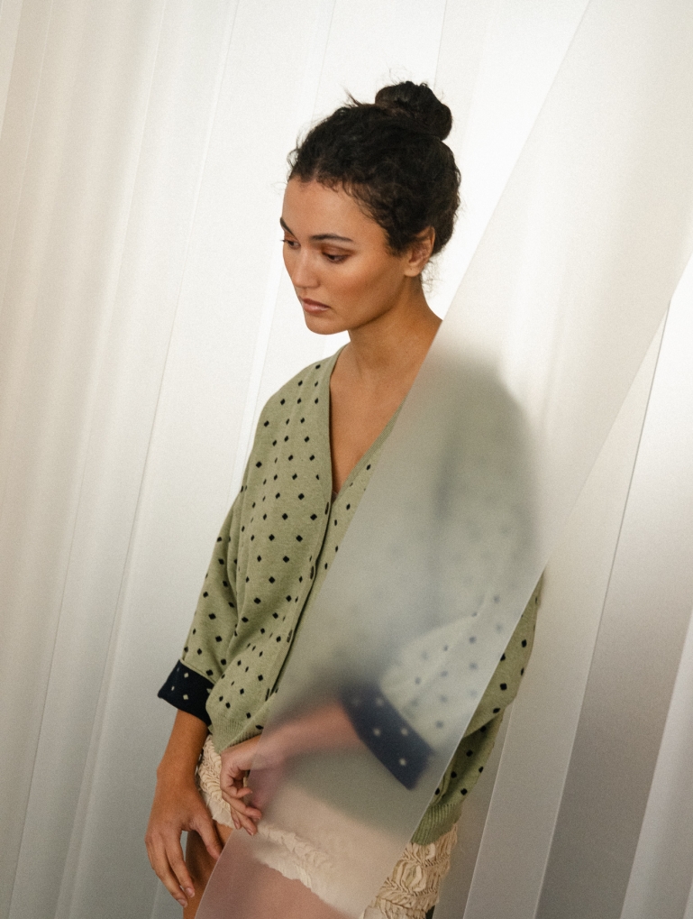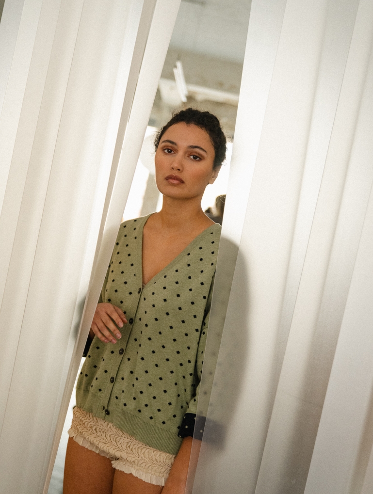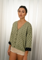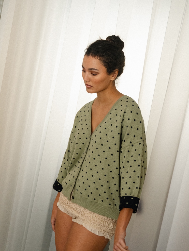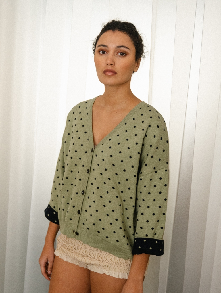 Un cardigan con mangas anchas tipo kimono. Queda genial con los puños remangados (el interior es de otro color), y es perfecto como prenda exterior en primavera y en las tardes frescas de verano. Con un estampado de lunares que le da un toque sofisticado y alegre. En color verde laurel con lunares en marino.